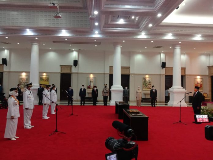 Serang – Gubernur Banten Wahidin Halim resmi melantik Bupati Serang dan Wakil Bupati Serang Ratu Tatu Chasanah-Pandji Tirtayasa, serta Wali Kota Cilegon dan Wakil Wali Kota Cilegon Helldy Agustian-Sanuji Pentamarta untuk masa jabatan 2021-2024. Pelantikan digelar di Pendopo Gubernur Banten, Jum’at 26 Februari 2021.
