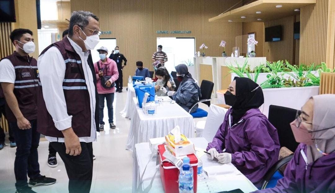 Tangsel – Wali Kota Tangerang Selatan, Benyamin Davnie didampingi Wakil Wali Kota, Pilar Saga Ichsan meninjau langsung kegiatan vaksinasi yang diselenggarakan oleh Badan Pengurus Pusat Himpunan Pengusaha Muda Indonesia (BPP HIPMI) di Mal Pelayanan Publik (MPP), Serpong, Minggu, 29 Agustus 2021.